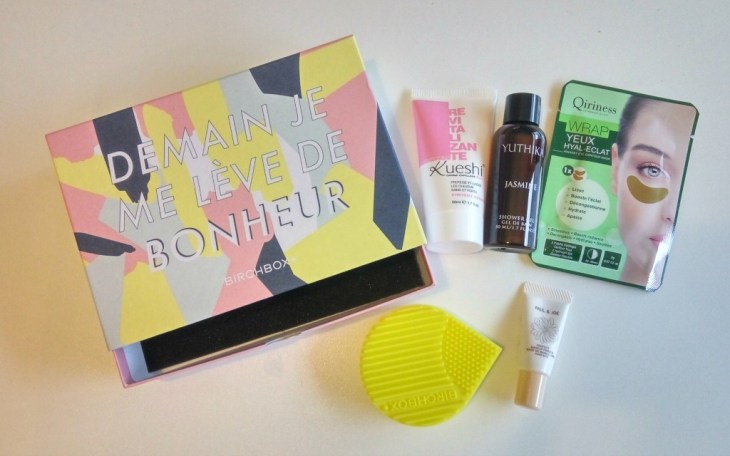 This month’s theme is “Que du Bonheur!”, which translates to “That of Happiness!”, to welcome the new year. Birchbox France costs €13 a month, with free postage to the Relay Point; I paid an extra €2 to have it delivered to my door. The box that it came in this month looks like a little drawer; it looks cute but it’s too flimsy to be useful.