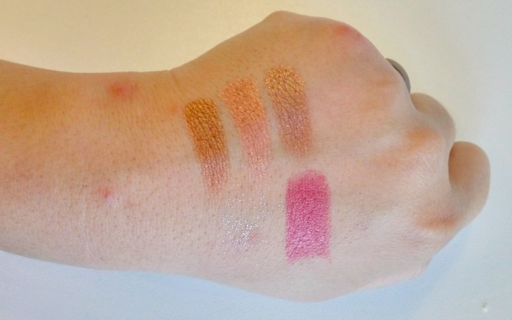 This looks like a really pretty highlight palette! The formula feels very nice; the texture is smooth and buttery, and pigmentation is pretty good. One issue though – it’s a little dark to work as a highlighting palette on me; the three shades appear bronze, peachy, and taupe on my skin, but I think they would work well as eyeshadows too so it won’t be a waste.