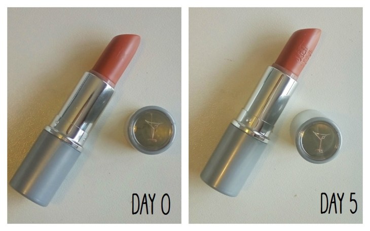 I started with a barely used lipstick – the Tini Beauty Lipstick in Irish Creme; I didn’t really like the colour so I didn’t mind wasting it. This has a rather creamy texture and it’s not drying at all, so it was pretty comfortable to test. I really didn’t like the lipstick colour at the beginning, but as I use it every day, I’m actually starting to really like it, and am regretting a little about wasting it on this experiment. But we’re not quitting here when I’m already so far in!