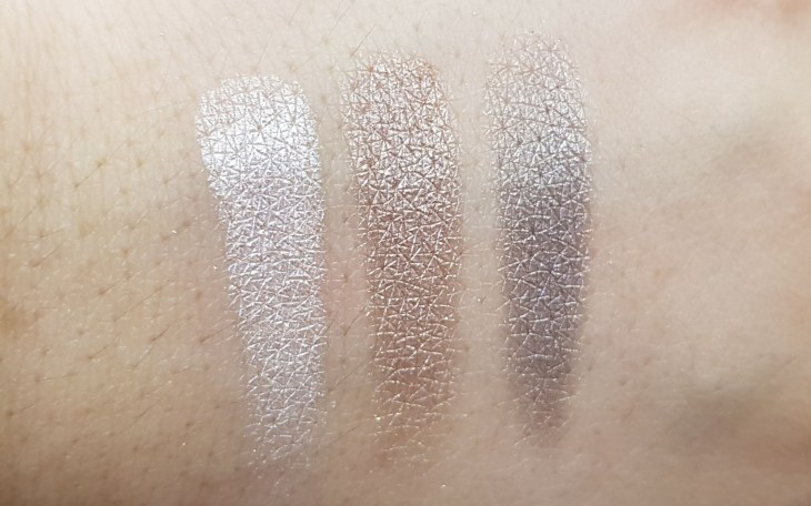 For the matte row from left to right, there is a cream beige, medium coffee brown, and a deep brown. Across the matte shades, they are very buttery and applied smoothly. I thought the beige was just a tad more powdery than the other two shades, which I fixed by tapping off any excess on my brush, but otherwise I had a flawless application with them. I love how wonderfully these matte shades blended and how smooth they felt.