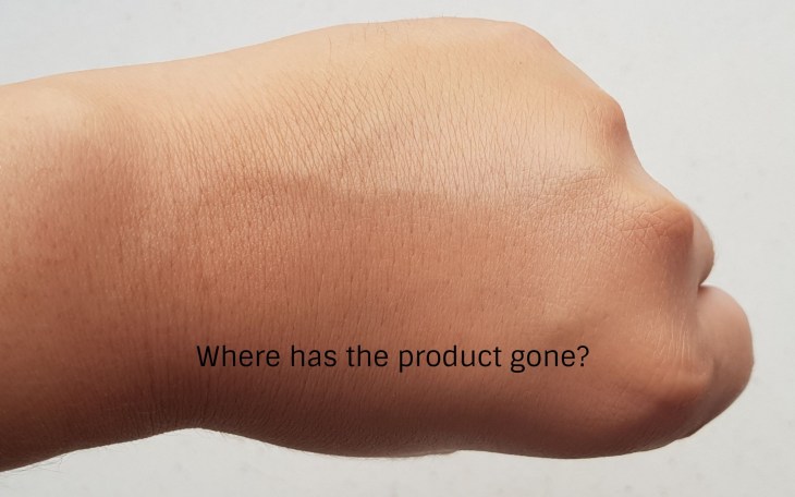 Sadly, this cushion did not work for me. Perhaps the colour was too light for me – but my face is even lighter than my hands and it does appear as a dark streak across my face when I don’t blend it but once blended it still did not show up on my face. The texture is actually really nice – it’s nice and light without being sticky. I don’t know about the lasting power as I can’t see anything there. I’m still trying to see how I could make it work – perhaps with a brush, or letting it dry down a little first; if I get any better results then I will report back, but until then this was quite a let down for me.